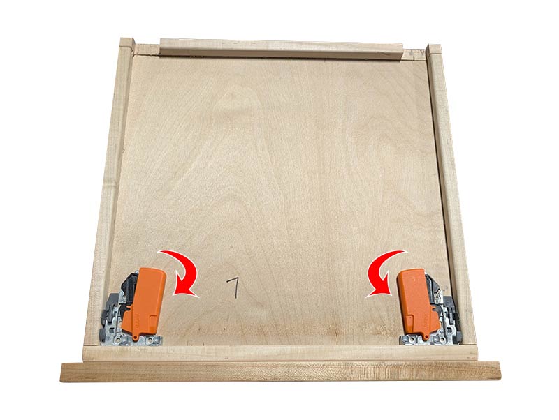 To remove the drawer box, start by locating the two orange release clips positioned underneath the drawer—one on each side near the front corners. Grip both orange levers firmly with your fingers and pull them toward you at the same time. This action releases the drawer box from the undermount glides, allowing you to gently lift and slide the drawer forward and out of the cabinet. Be sure to support the drawer with both hands as you remove it to prevent it from tipping or binding on the tracks.