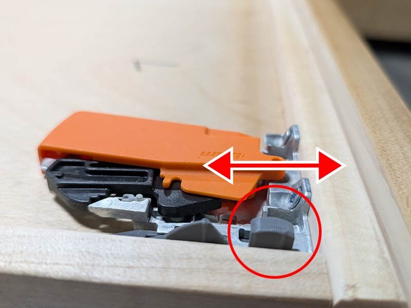 With the drawer box removed, you can access the rear adjustment wheel located at the back of the undermount glide. This small circular dial can be turned left or right to slightly pivot the entire glide, adjusting the drawer’s horizontal alignment within the cabinet. Adjusting this portion is not typically necessary in most situations, but it can be helpful if one side of the drawer sits unevenly or appears slightly out of level. Rotating the wheel in one direction will angle the drawer front to the left, while turning it the opposite way shifts it to the right. These fine adjustments help ensure the drawer front lines up evenly with surrounding drawers and doors, providing a clean, uniform appearance once reinstalled.