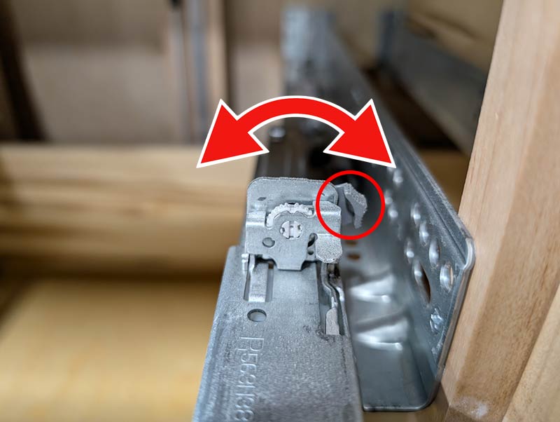 The gray adjustment pin shown near the front of the glide can be adjusted forward or backward to fine-tune the height on that side of the drawer. Adjustments in one direction raise the drawer slightly, while adjustments in the opposite way lower it. This step is especially important if your drawer isn’t closing all the way on its own. In many cases, the issue is caused by the drawer box rubbing or catching on part of the cabinet, which prevents the soft-close mechanism from fully engaging. By making small adjustments with the front pin on each side, you can level the drawer box and eliminate binding points, ensuring it glides smoothly and closes completely. Once aligned, the drawer front should sit evenly within the cabinet opening and line up perfectly with neighboring drawers or doors.
