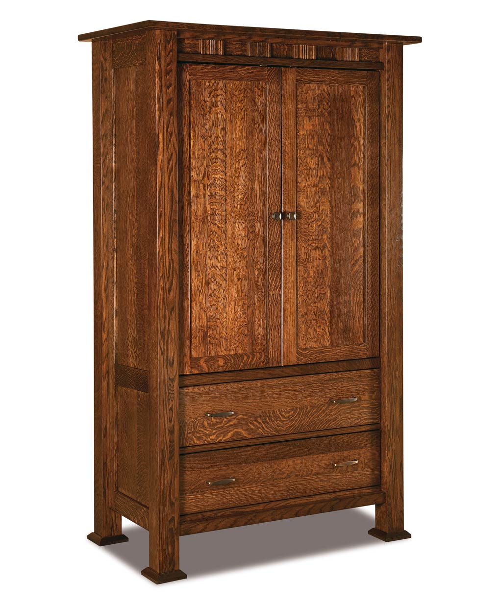 The Sequoyah Armoire showcases artisan craftsmanship with its solid wood structure, featuring clean lines, paneled doors, and two spacious drawers.