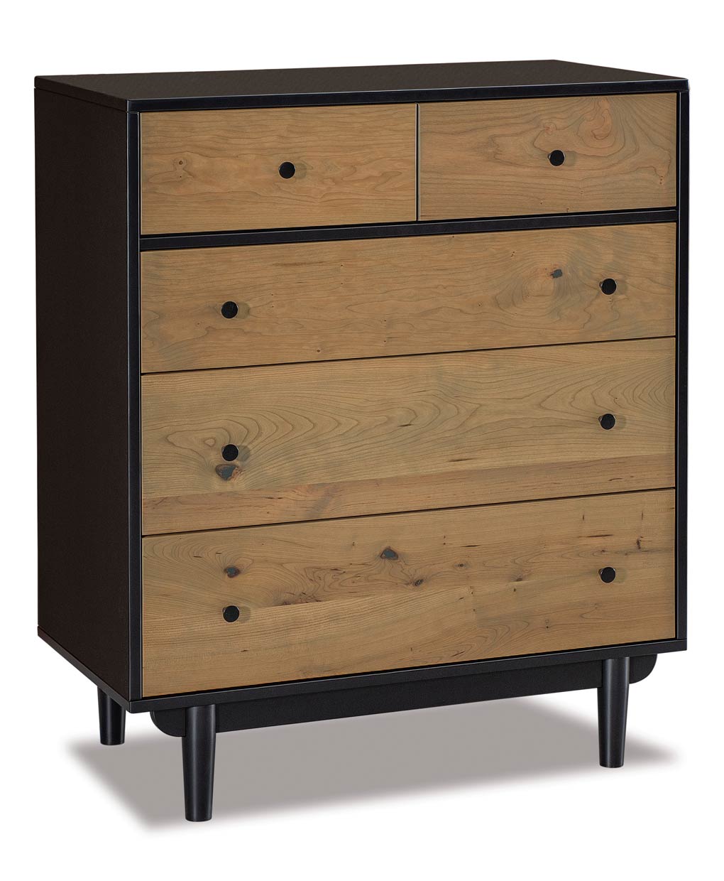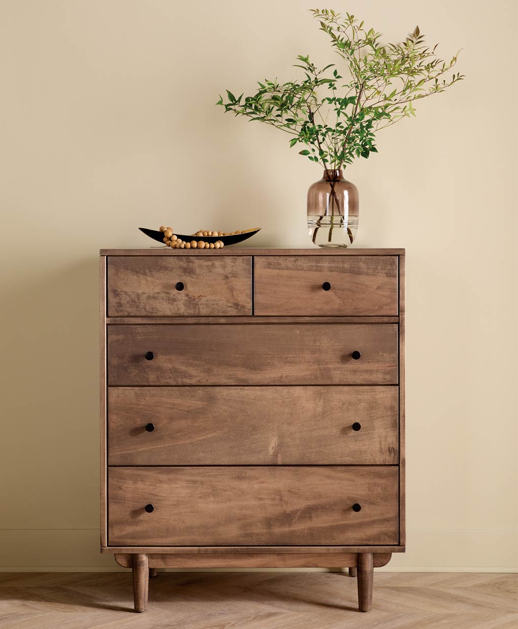 Enhance your decor with the Baymont 5 Drawer Chest, combining minimalist Amish craftsmanship hints and practical storage in a timeless piece.