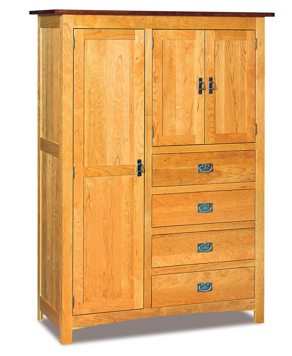 The Flush Mission Chifferobe features the classic craftsman Mission style. Straight clean edges grace every piece of the collection. Features 4 drawers, 3 doors, and 4 adjustable shelves.