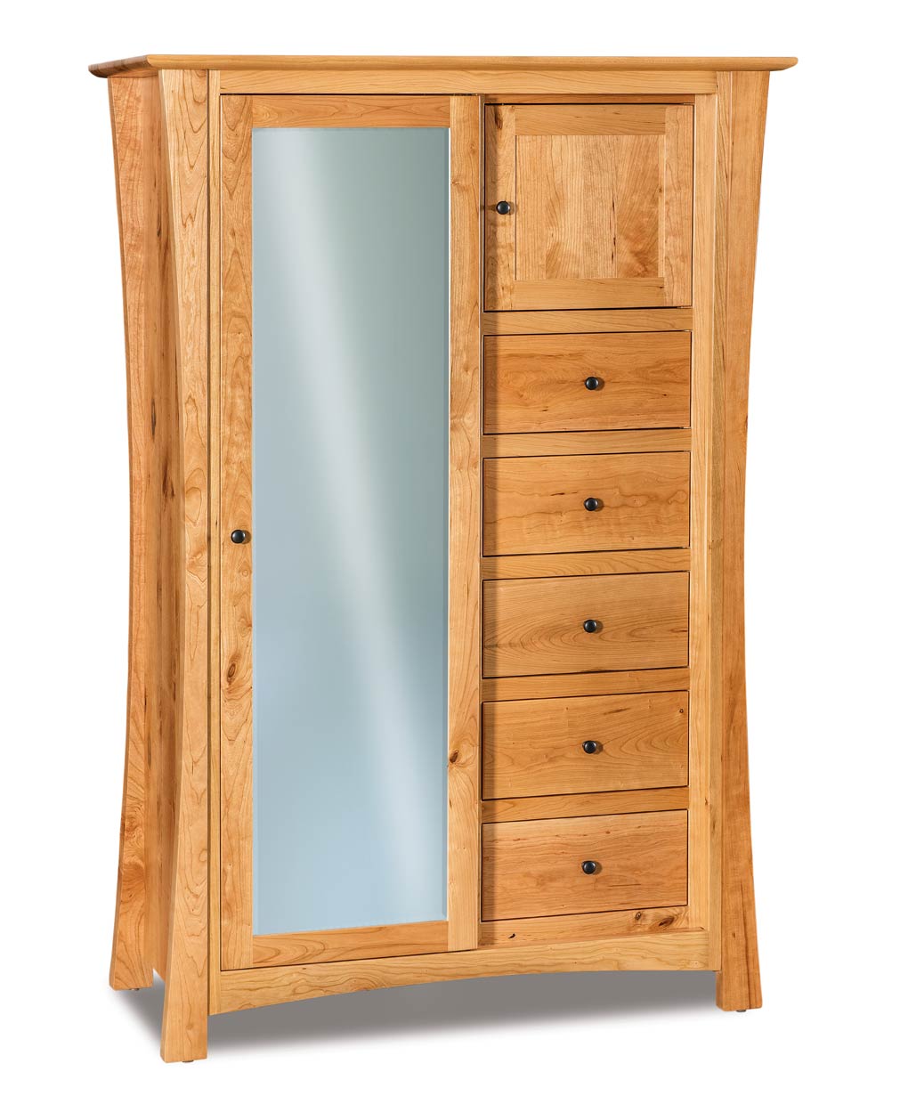 The Matison Sliding Door Chifferobe soft concave curves and flush doors & drawers offer a unique option for your bedroom collection.