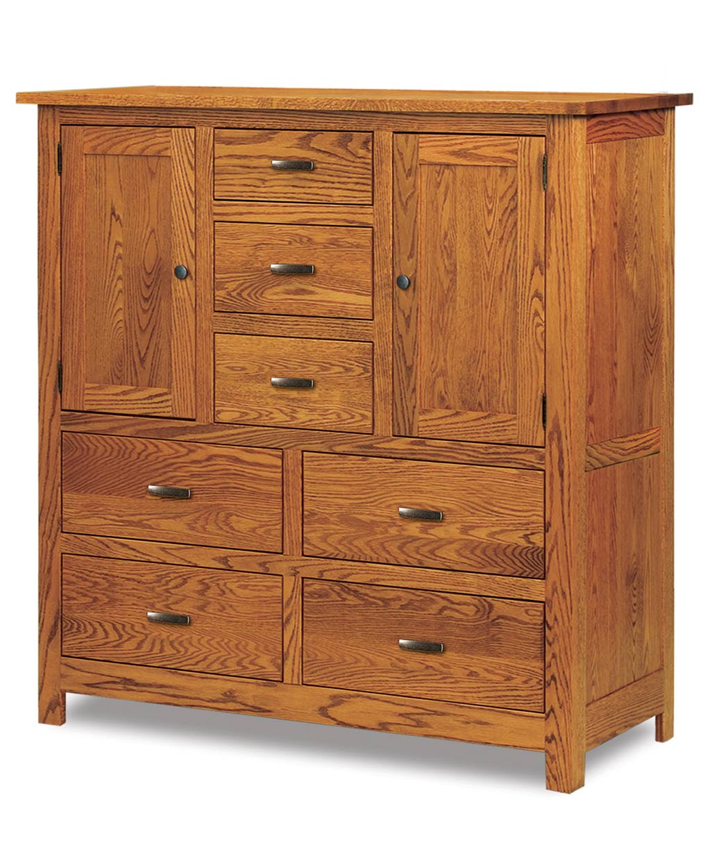 The Flush Mission His and Hers Chest features the classic craftsman Mission style. Straight clean edges grace every piece of the collection. Features 7 drawers, 2 doors, and 4 adjustable shelves.