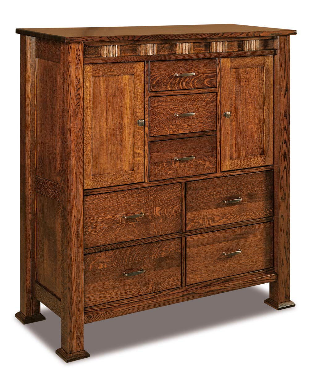 The Sequoyah His & Hers Chest showcases a sophisticated structure with a combination of layered panels and seven drawers, topped by unique decorative accents.