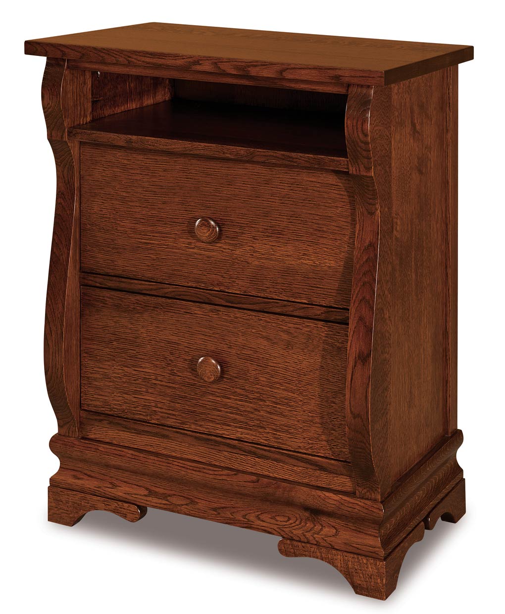 The Amish-made Chippewa 2 Drawer Nightstand features elegant curved sides, functional open shelf space, and two spacious drawers, perfect for stylish bedroom storage.