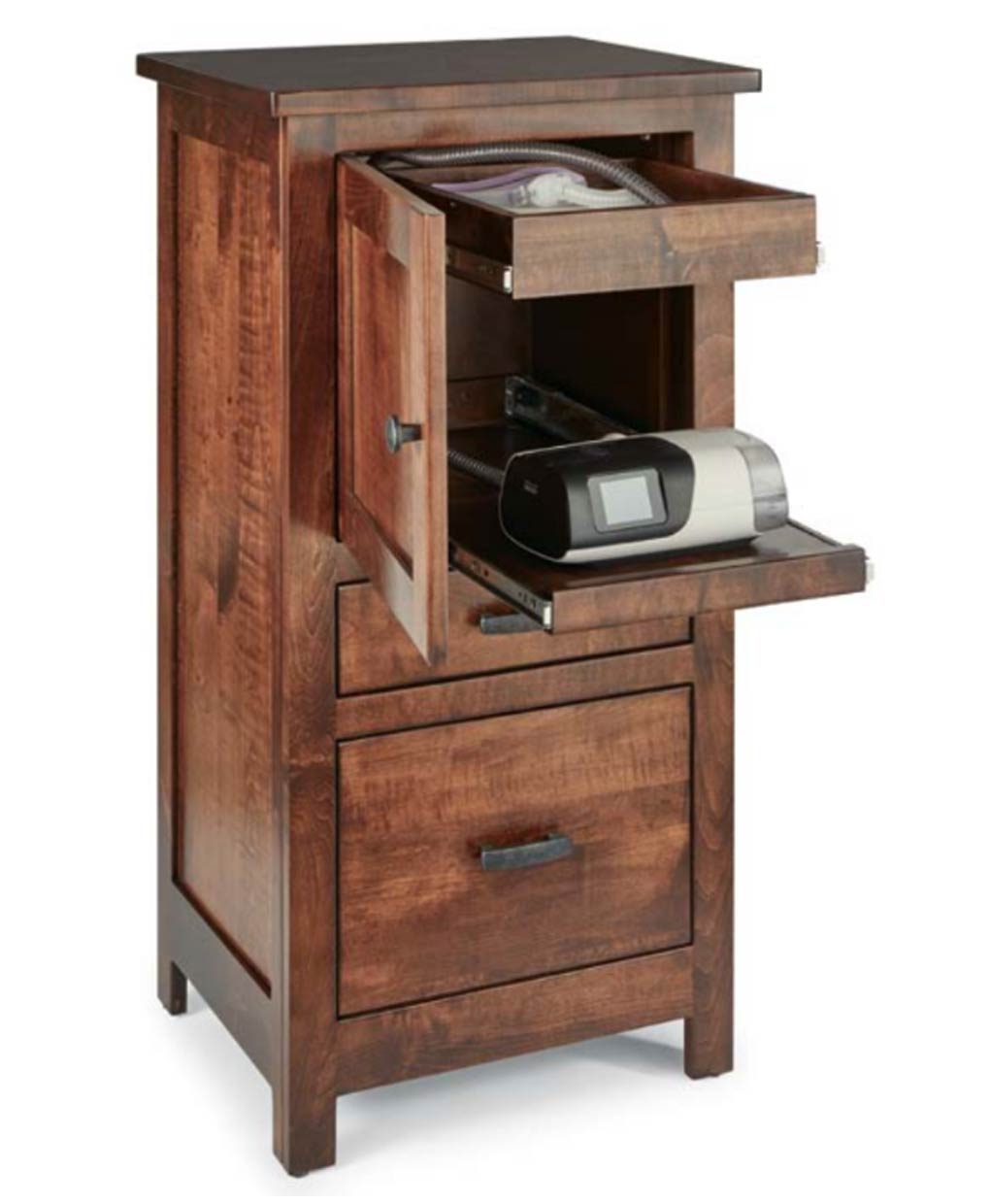 The Amish-made Lincoln C-PAP Nightstand combines functional storage with a classic design, featuring a cabinet and drawers for convenient bedside organization.