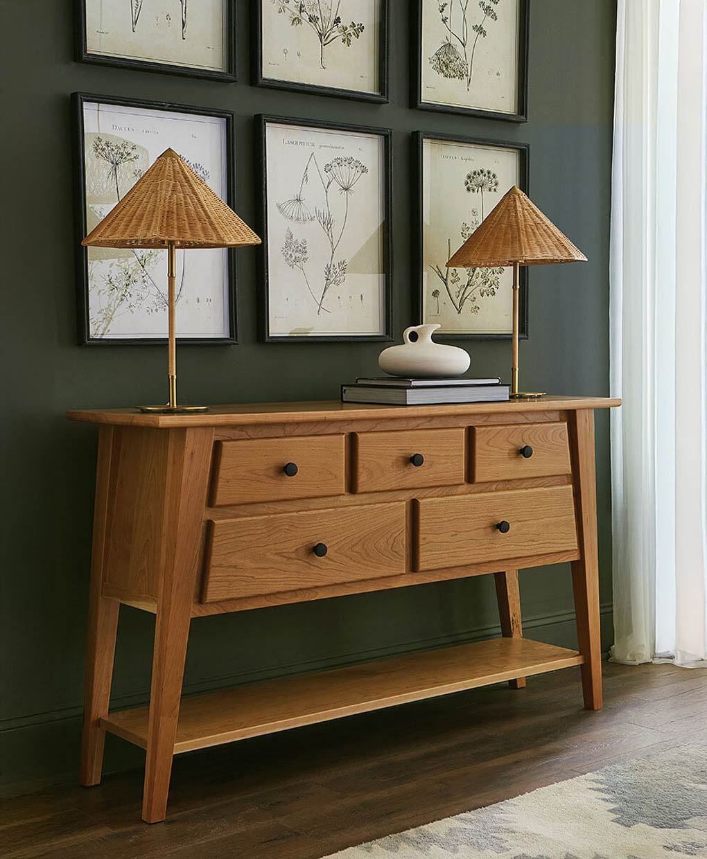 The Bersina Server showcases a blend of mid-century design and functionality, featuring five drawers and a lower shelf for versatile storage and display.