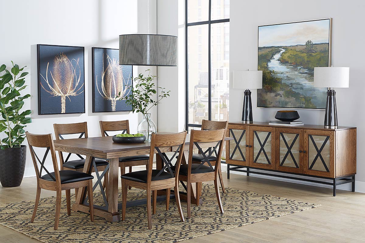 The Amish-made Oxford Trestle Table blends rustic charm and modern industrial design with a sturdy trestle base featuring sleek metal accents, perfect for any dining space.