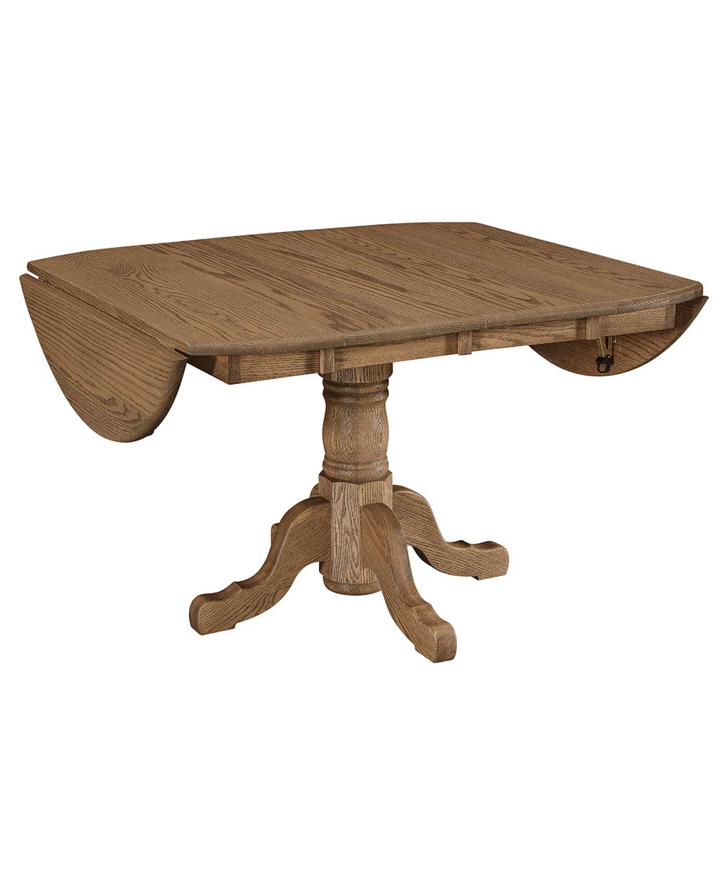 This heirloom-quality Homestead Pedestal Drop Leaf Table provides versatile dining, featuring a substantial central column leading to elegant, splayed legs.