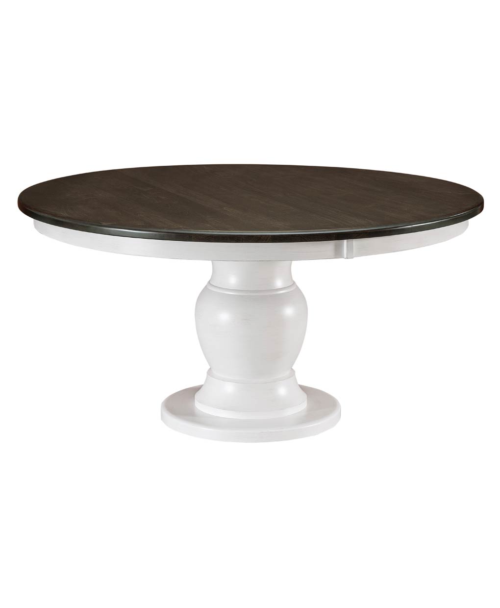The Sonoma Pedestal Table combines rustic charm with modern elegance, featuring a contrasting dark tabletop set on a classic white base, crafted by Amish artisans.