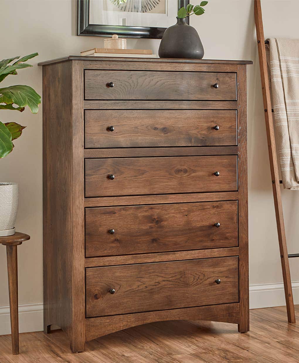 Enhance your storage with the Troy 5 Drawer Chest, expertly crafted by Amish artisans from solid wood, boasting durability and timeless elegance for any home.