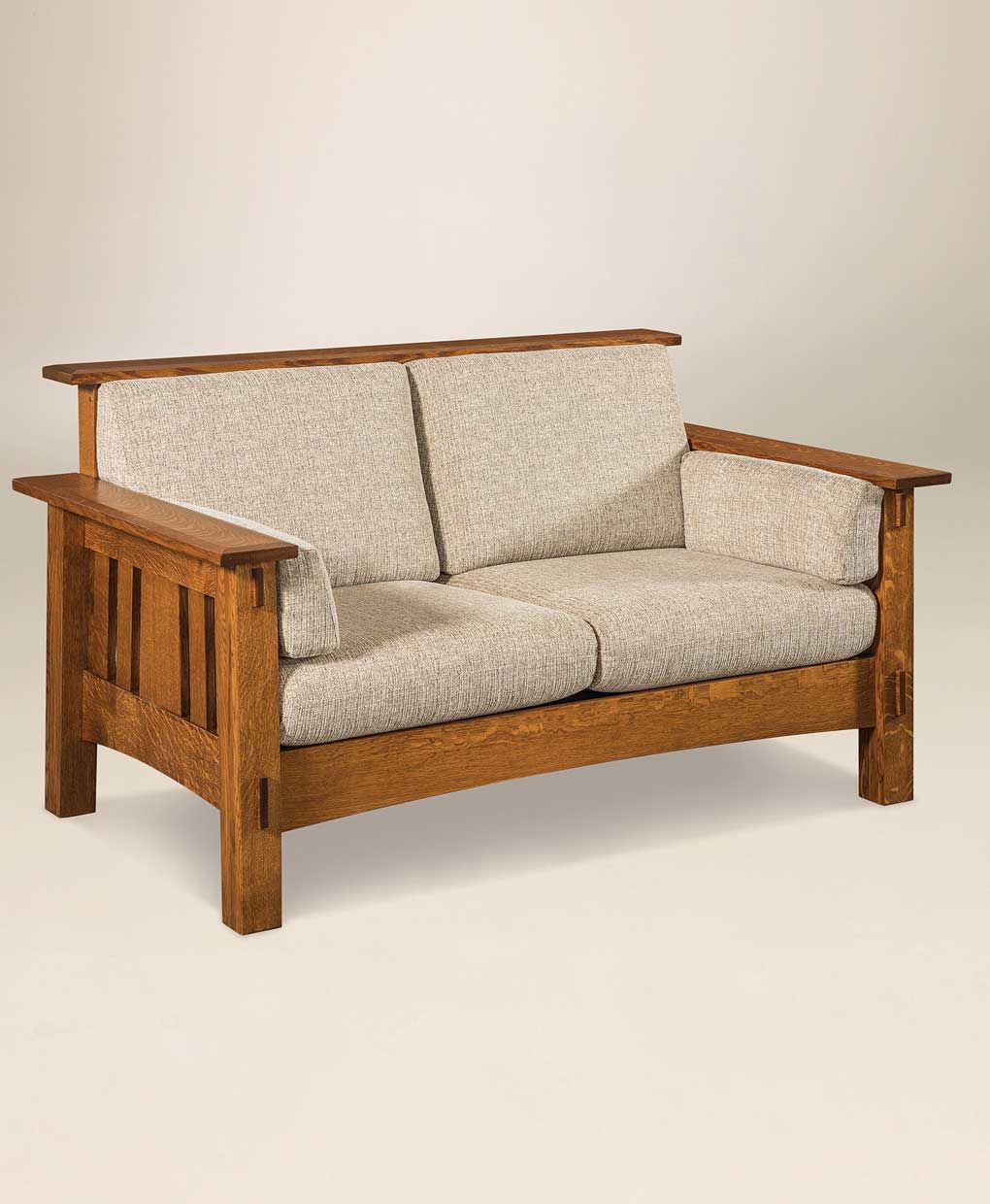 The McCoy Loveseat is designed with mortise and tenon joinery and open mission slat sides for a lighter, opened look.