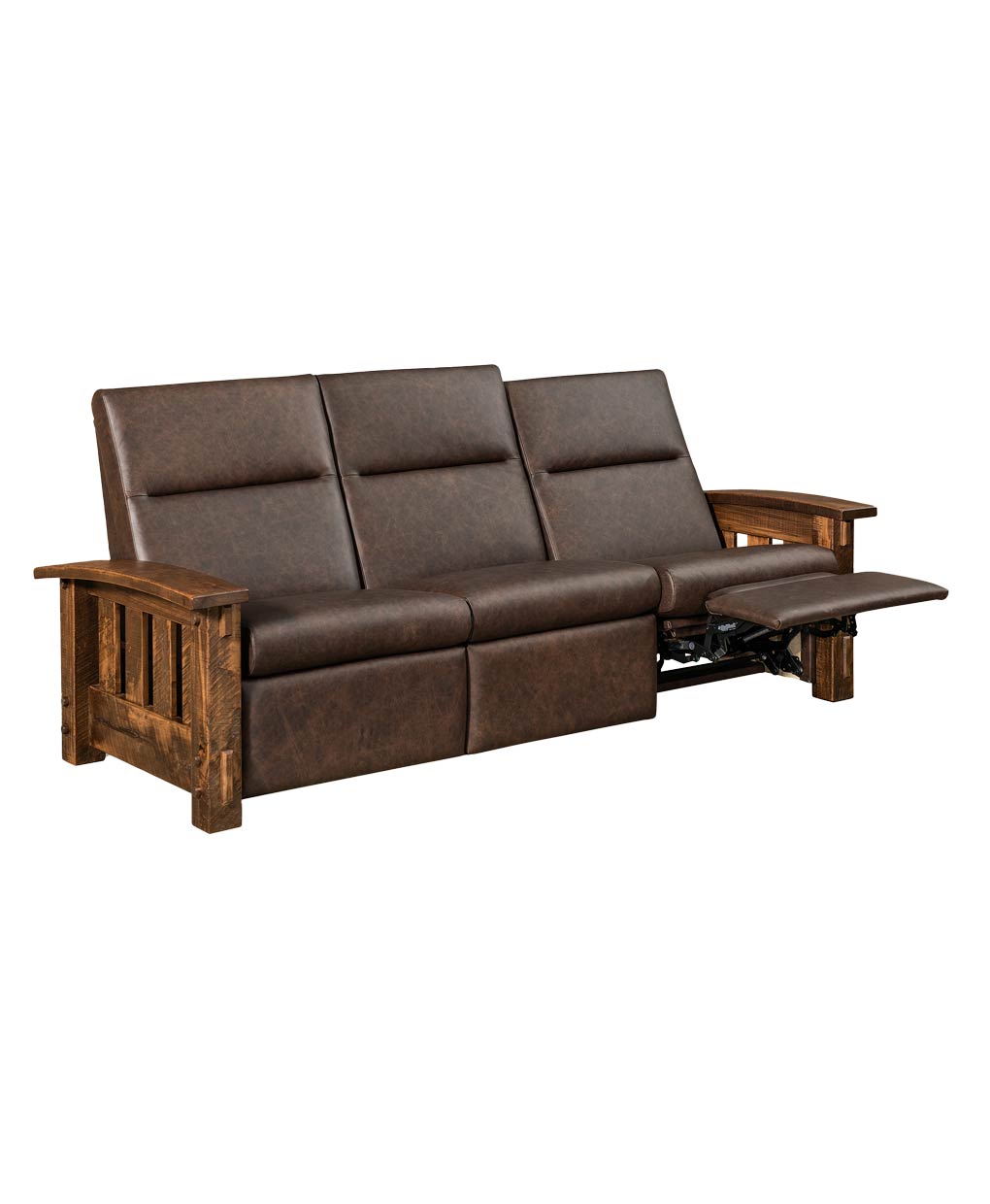 Elevate your rustic décor with the Houston Roughsawn Wallhugger Reclining Sofa, crafted by Amish artisans using genuine mortise and tenon construction.