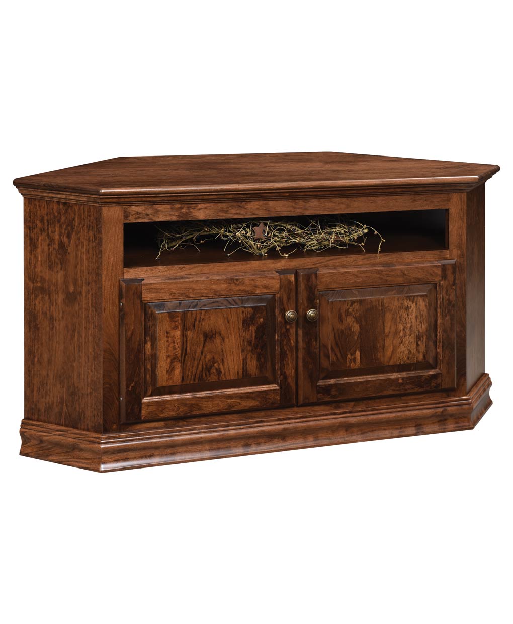 This Traditional Corner Wide TV Stand offers ample storage with its open shelving and cabinet doors, showcasing a solid wood construction.