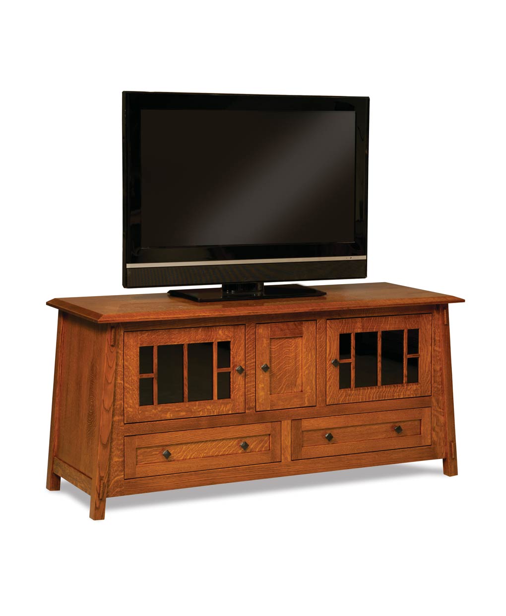 The Colbran 3 Door 2 Drawer Media Stand showcases an artisan solid wood frame with striking windowpane-style doors and clean, straight lines.