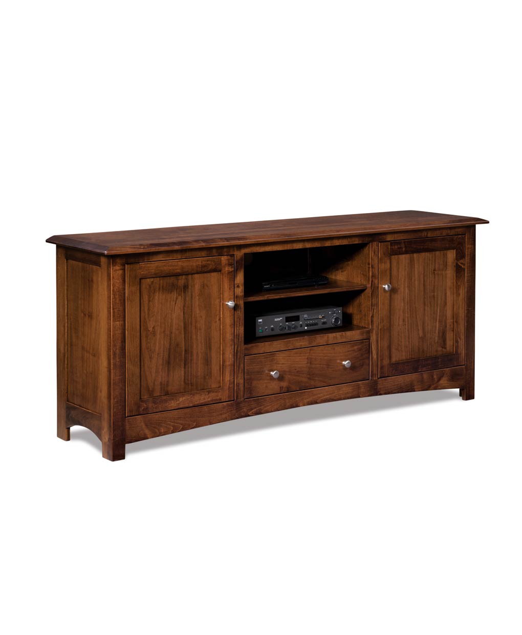 The Finland 2 Door 1 Drawer Media Stand is an heirloom-quality solid wood TV stand with clean lines, paneled doors, open shelving, and sturdy artisan construction.
