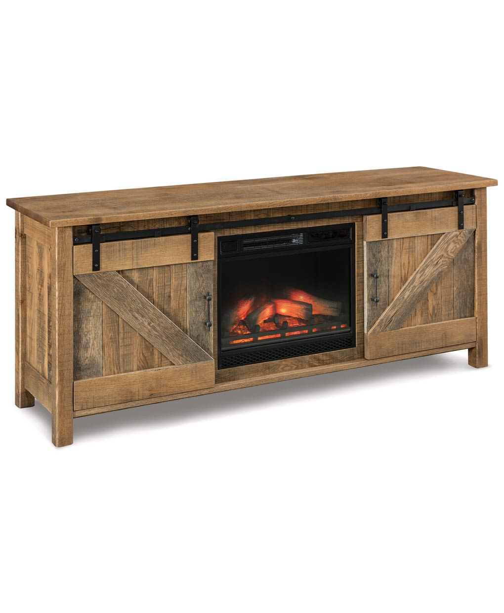 The Houston 2 Door Media Stand with Fireplace features artisan sliding barn doors, a built-in fireplace, and a sturdy solid wood frame for heirloom appeal.