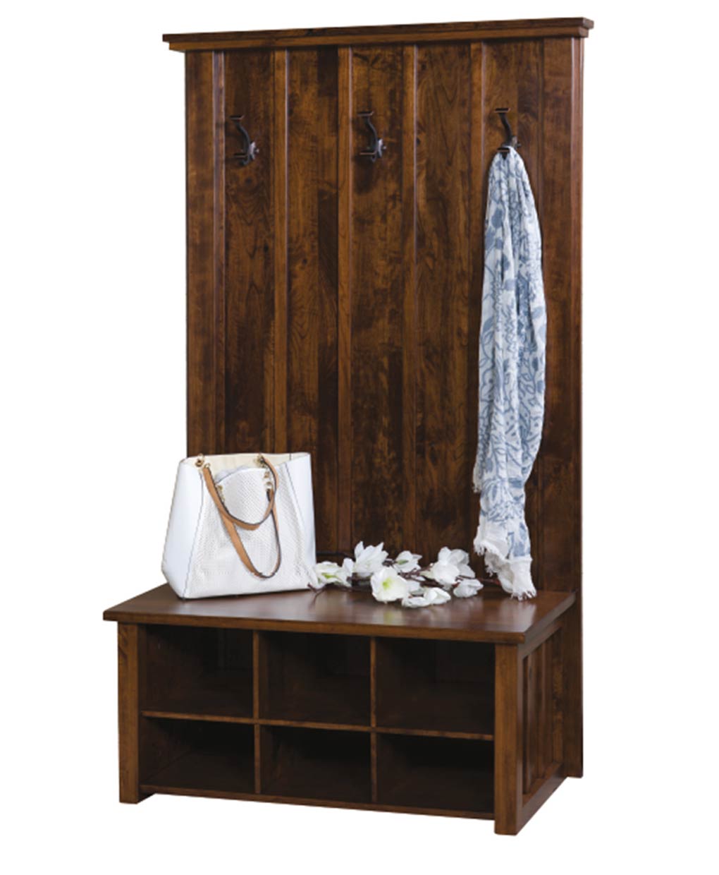 The Mason Hall Seat features a tall, solid wood back with rustic hooks and a seating area atop cubbies perfect for organizing your entryway essentials.
