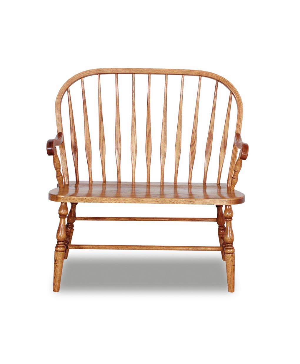 The Bent Feather Bow Bench features a high spindle back, elegantly curved arms, and a scalloped base, embodying artisan-crafted, heirloom-quality design.