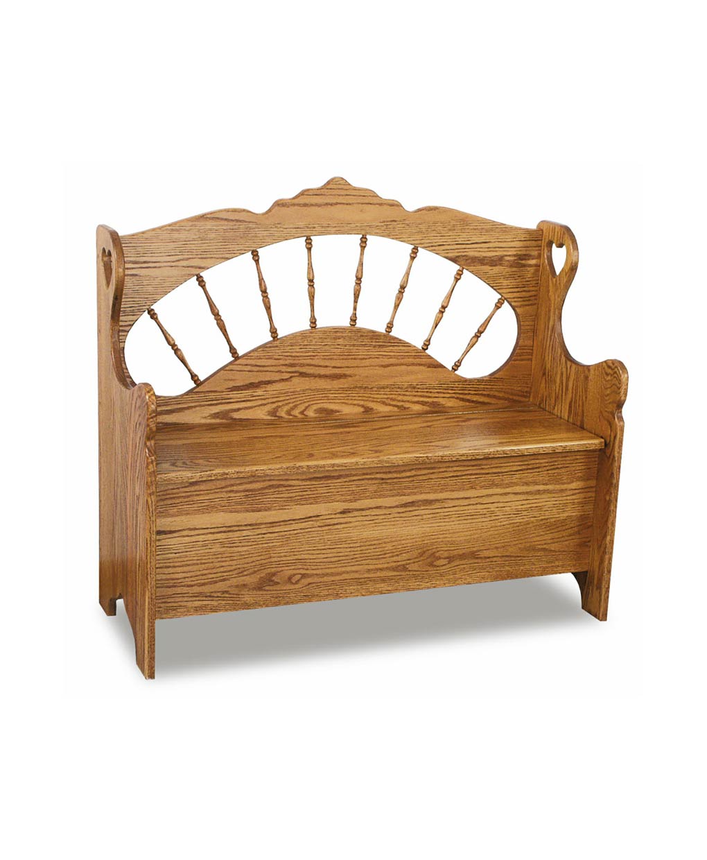 The Sunrise Spindle Bench showcases an elegant spindle back and charming heart-shaped armrests, blending artisan craftsmanship with heirloom-quality design.