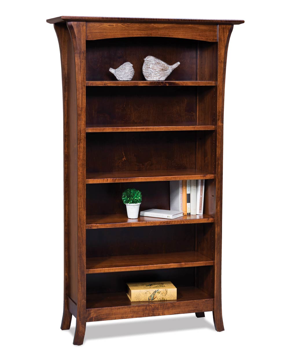 The Ensenada Bookcase features gently curving sides, an arched top frame, and spacious shelves for functional, heirloom-quality storage and display.