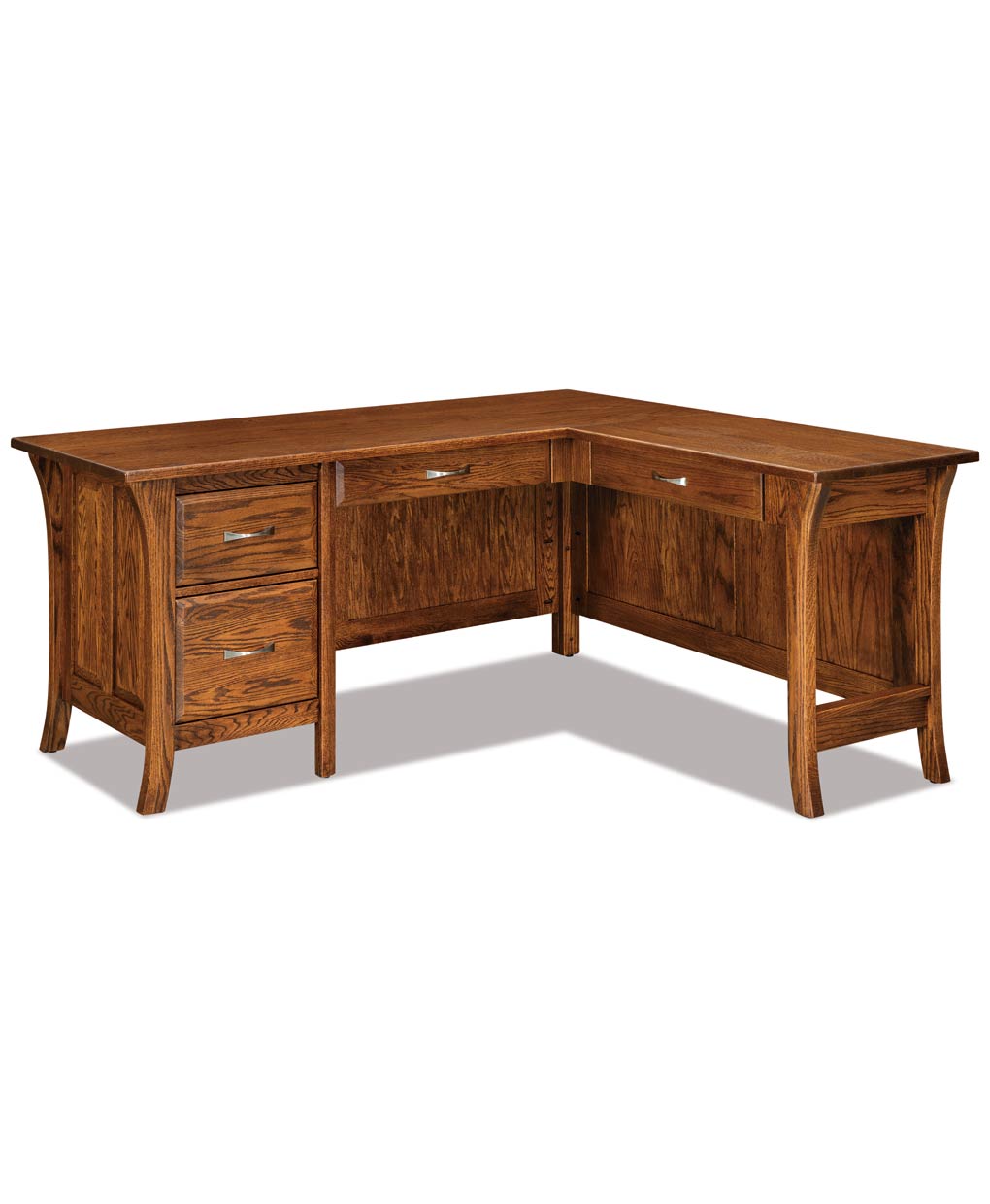 The Ensenada 4 Drawer L-Desk features a solid wood frame, flared legs, clean panel sides, and spacious storage for an executive office.