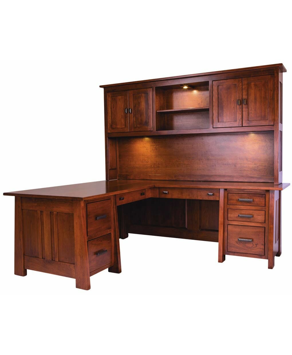 This Freemont Mission Corner Desk has finished backs on both desk and return to fit anywhere in your room. The return can be ordered as left or right and it has three file drawers and two smaller drawers with a keyboard pullout and pencil drawer standard. The Freemont Mission office set offers a solid mission look to your office. Tops are 1" square mission edge. All drawer slides are full extension. The Freemont Mission set is available in all wood species or in a combination of light and dark woods.