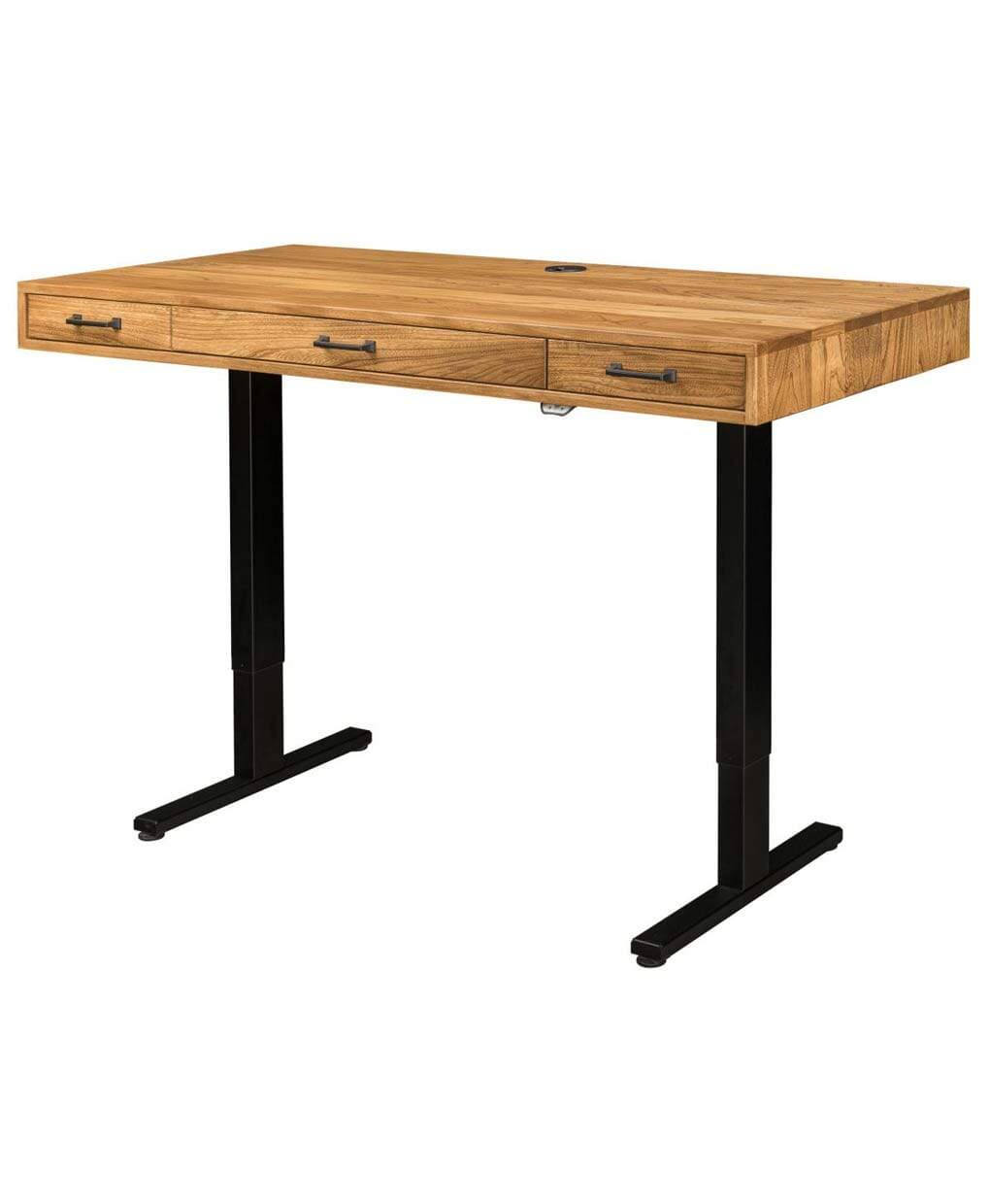 The Bordeaux Lift Desk features a solid wood top with a robust, industrial-inspired base, offering a stylish and functional workspace.
