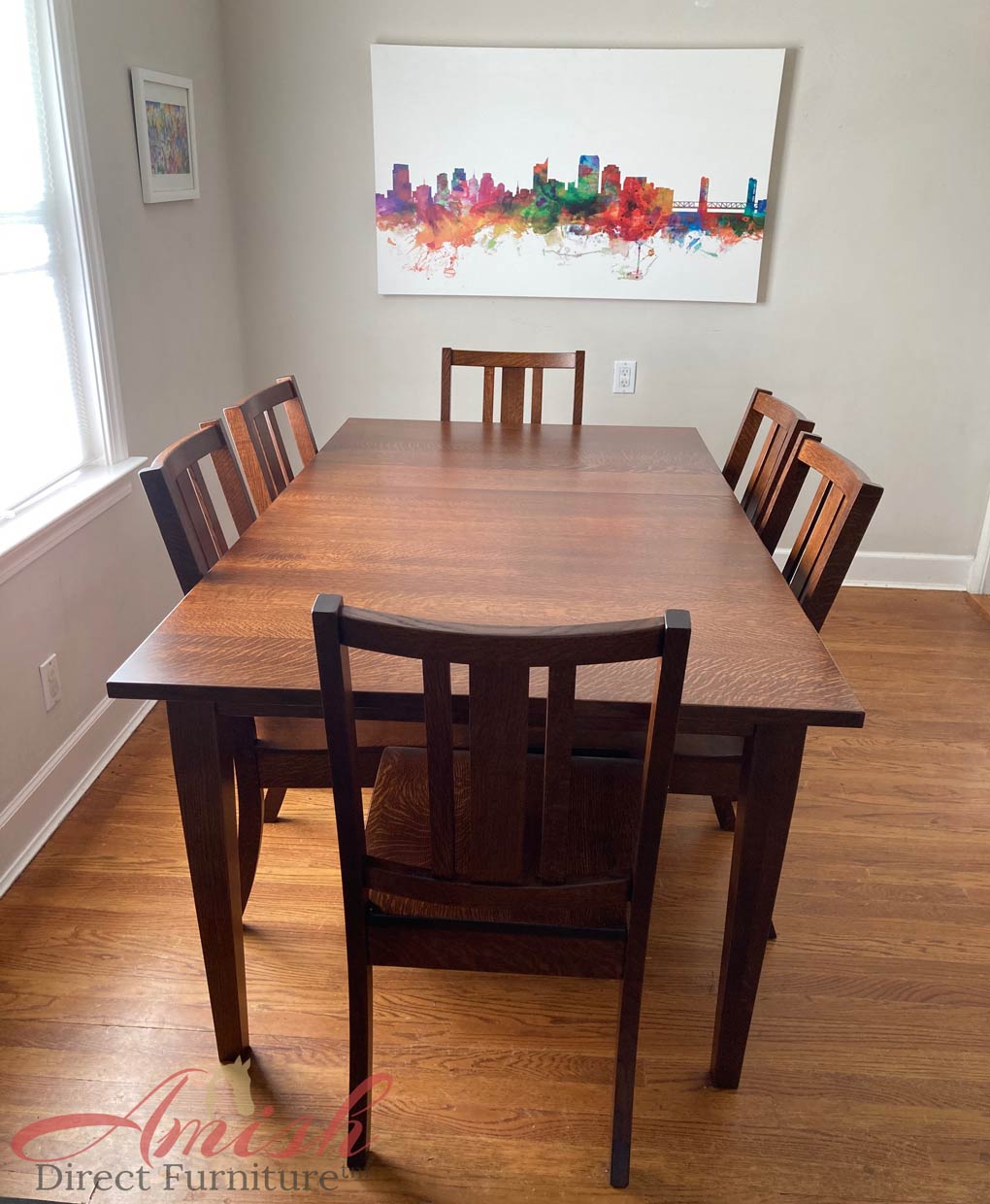 We absolutely love this beautiful table! We got extra leaves for expansion and ended up leaving one in permanently, as it fit even better in our dining room than we thought. The quality of the build is wonderful, the finish is smooth, the grain of the wood (quartersawn oak) and stain (Golden Brown) are beautiful, and the table is clean-lined and sturdy. Definitely recommend! Customer service was great too!