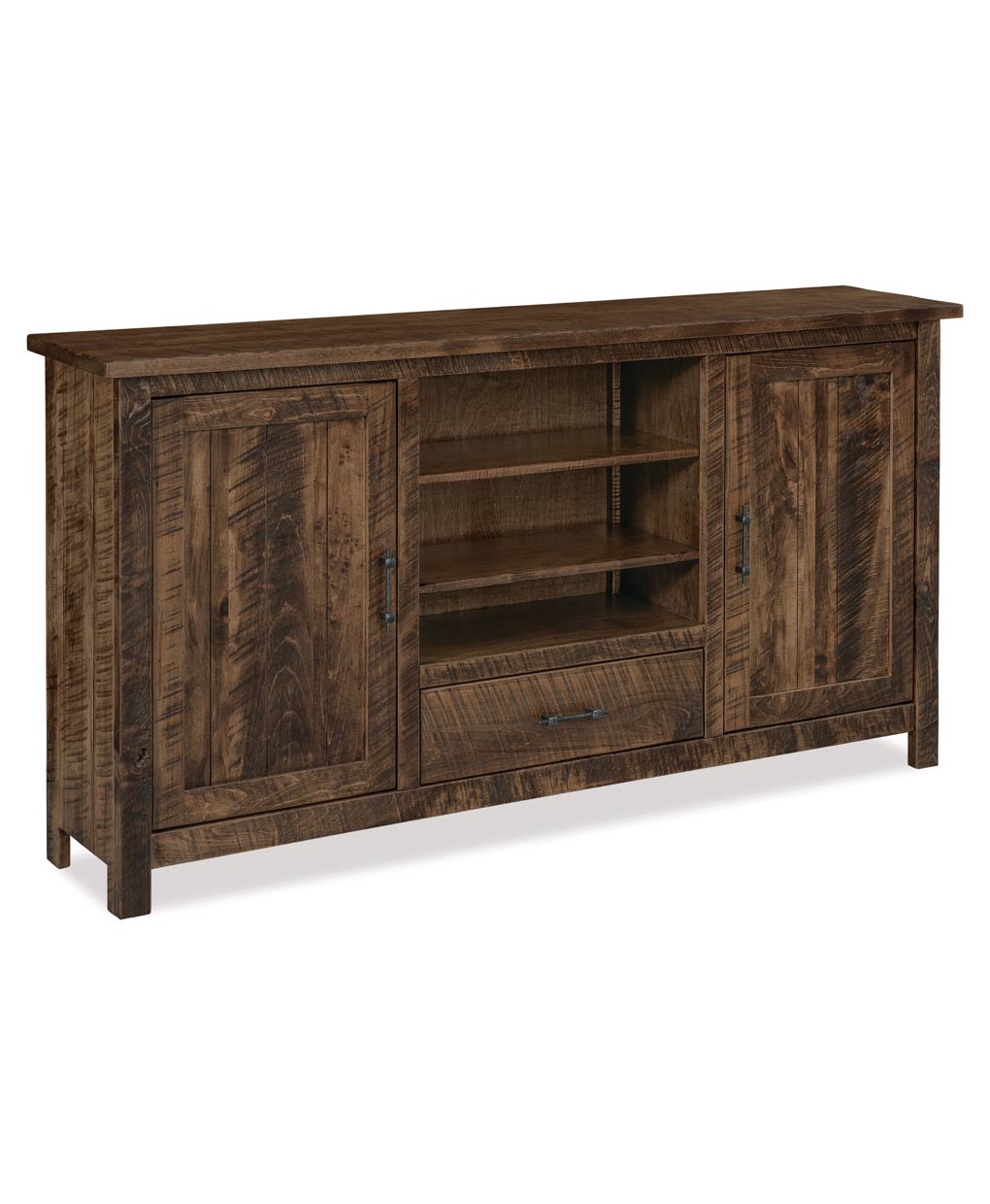 The Houston Media Stand features a solid wood frame, two side cabinets, open center shelves, and a lower drawer for versatile media storage.